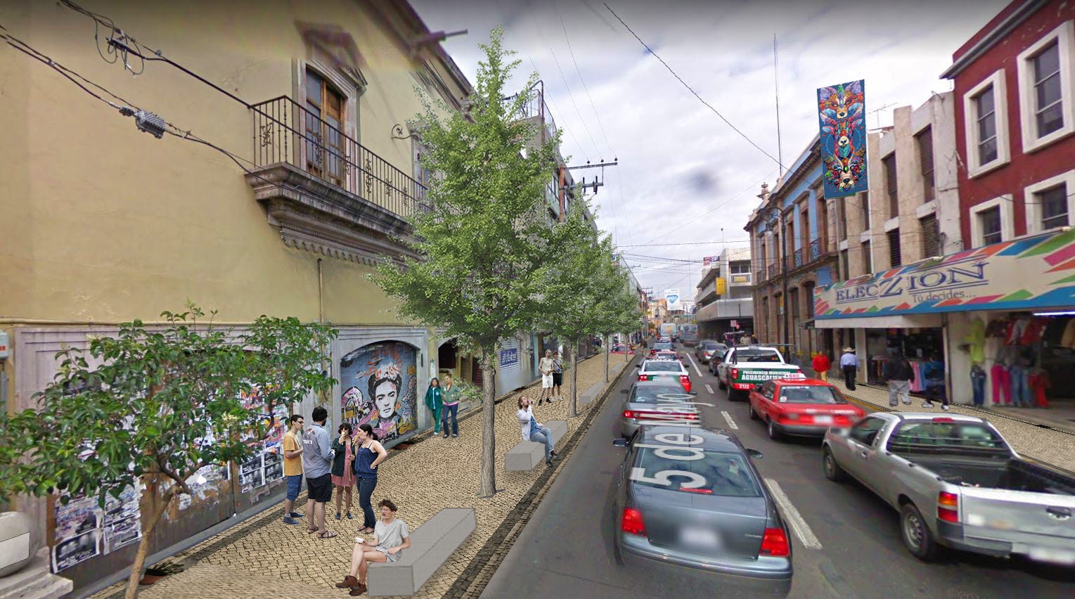 Calle 5 de Mayo runs through Aguascalientes’ historic downtown and primary commercial corridor, one of the city’s most heavily trafficked pedestrian environments. Despite its centrality, the street’s sidewalks were critically undersized, forcing pedestrians to compete for space with vehicles on oversized travel lanes that prioritized car throughput over human safety.