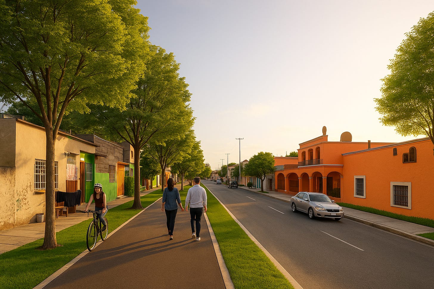 This right-of-way could become the backbone of a walk-and-ride network for Campeche. These paths, lined with trees for shade and protected from motor traffic, would offer easy, comfortable, and convenient walking and cycling opportunities, while also providing connections to our high-frequency urban bus network.