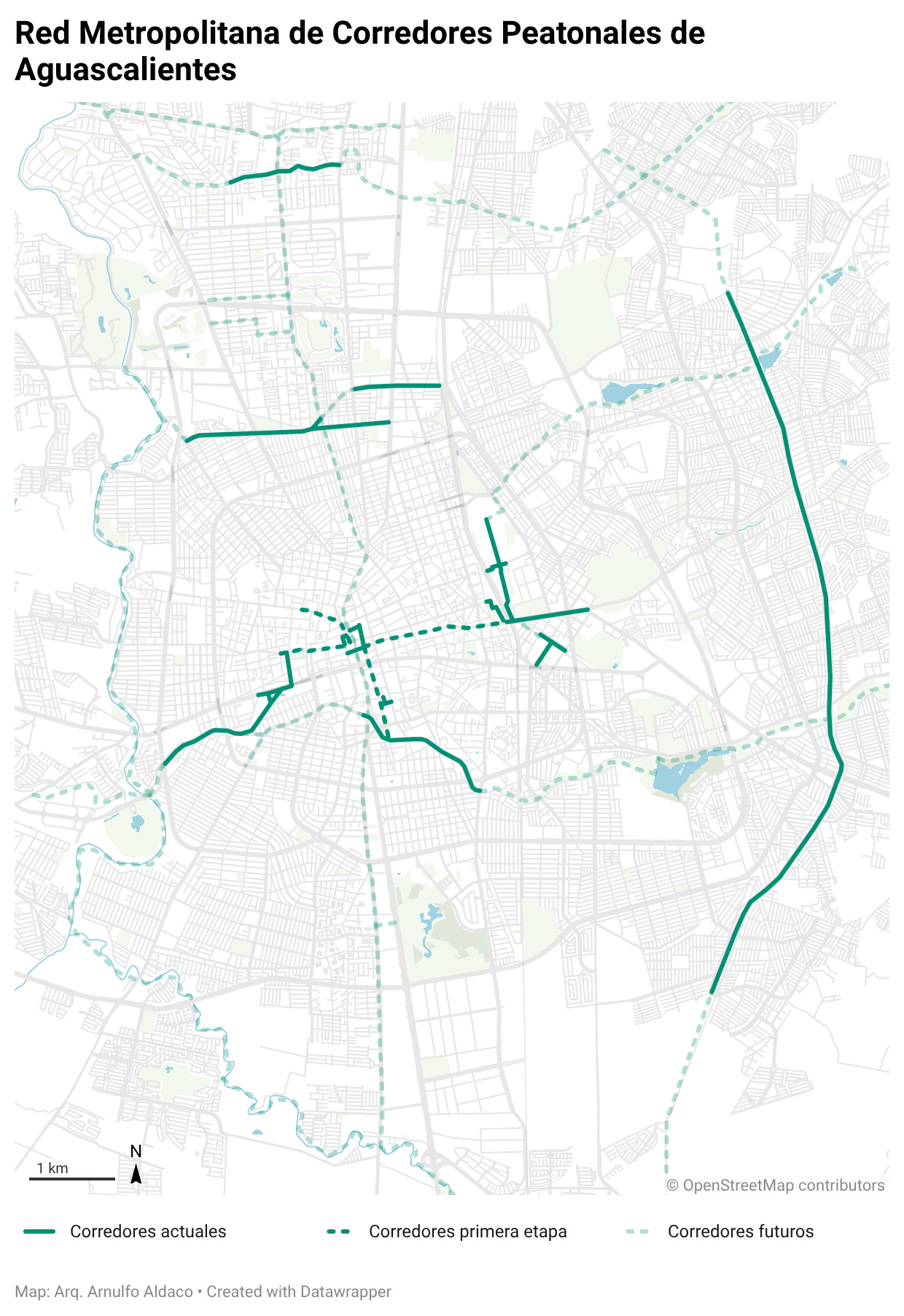 This project proposes a metropolitan network of walkable, safe, and shaded pedestrian corridors connecting schools, hospitals, neighborhood centers, and public spaces across the Aguascalientes metropolitan area.