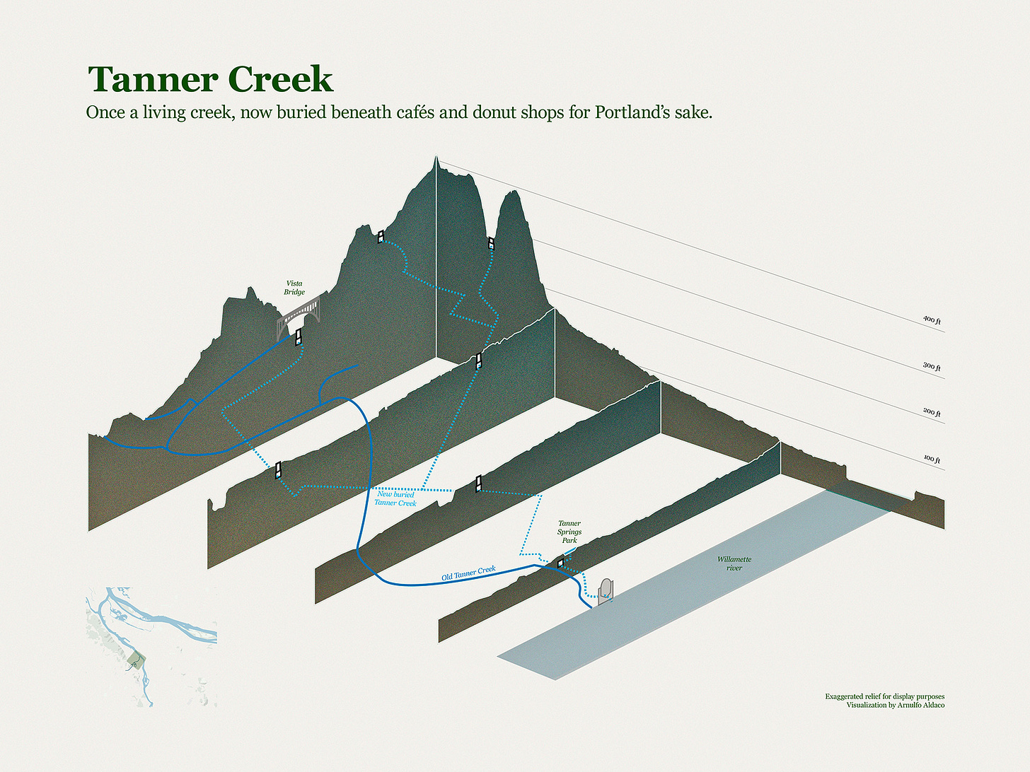 Diagrammatic reconstruction of Tanner Creek’s buried course beneath downtown Portland. The drawing explores how urban development, infrastructure, and real estate pressures erased a natural system, replacing it with hidden hydraulic networks.